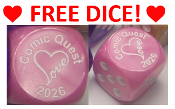 FREE Holiday Dice – St Valentine’s Day Posted on February 10, 2026February 10, 2026 FREE, because we heart you so much. No purchase necessary, just stop by Comic Quest. Keeping the 10+ year tradition of giving away holiday dice. Limited edition. Supplies can run out. Posted in Dice - Holiday, Promotions and tagged comics.